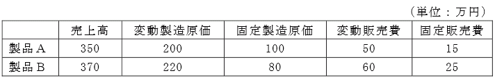 下表のデータを用いた限界利益の数値として適切なものは、次のうちどれか。