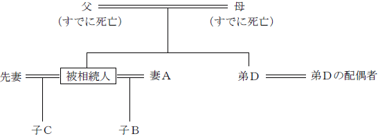 妻A 1/2、 子B 1/4、 子C 1/8、 弟D 1/8