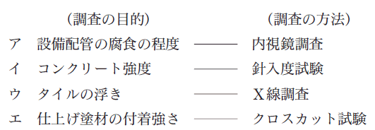 マンションの建物の劣化診断における調査の目的と方法に係るア~エの組合せのうち、適切なものの組合せは1~4のうちどれか。